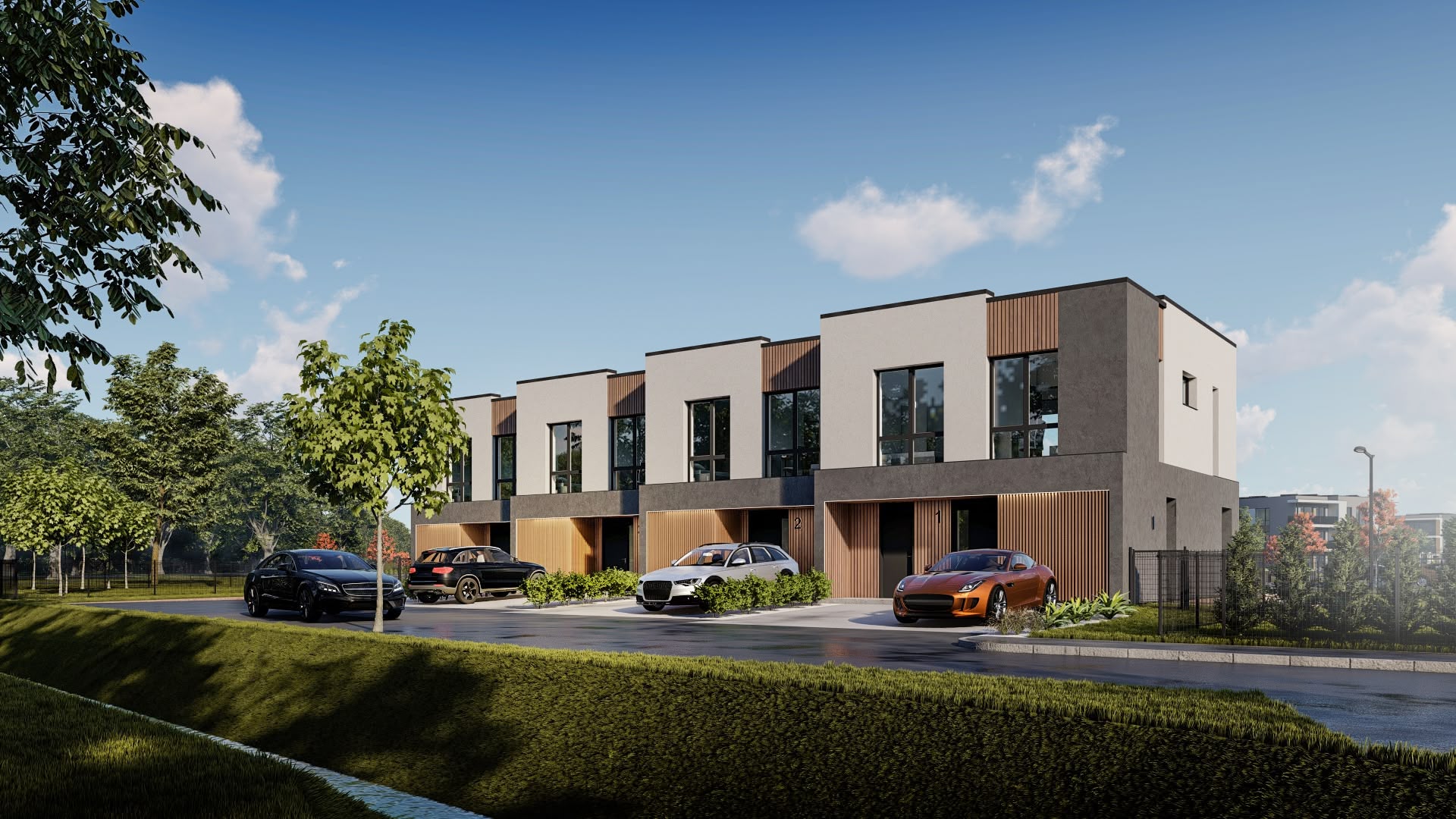 Põhjamaise arhitektuuriga, 104–105 m², nelja magamistoaga, ning saun igas boksis. Nurbaboksidel pea 1000m2 hoovialad.